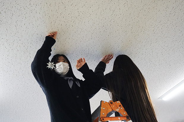 清和のクリスマスを彩る飾りつけの中に「フレーベルの星」があります。「フレーベルの星」というのは、ドイツの幼児教育学者フレードリッヒ・フレーベルが考案した、紙で折る星のことです。細長いリボンのような紙を4枚使って折った星は複雑で立体的な形をしています。毎年美術の先生と一緒に中1が、この星やビーズを連ねた飾りを本館2階のホールの天井などにつるして飾っています。今年も2階のホールが一層華やかな雰囲気になりました。