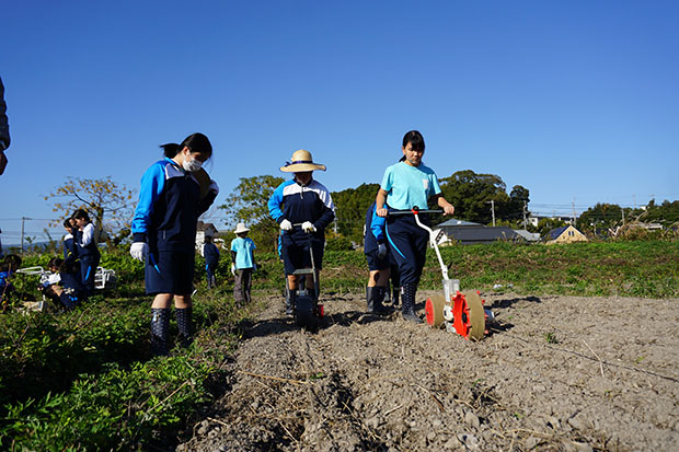 2学期最後の授業となった今回の「清和オーガニクス」は2班に分かれ、来年度用の麦の種を撒きと焼き芋の火おこしをしました。
