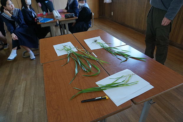 今回の授業では教室で、自分たちが育てて食べる「小麦粉」の成分「グルテン」の話しや、畑に育っている麦を根っこから引き抜いて観察しました。先日行った麦踏みで根っこがどのように強くなっているのか、この冬の暖冬で育ちの早い麦の中はどんなことになっているのかを谷川先生の説明を聞きました。成長の早い麦は2月だというのに中にはもう穂が準備されています。