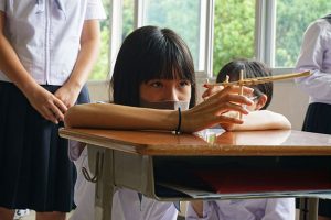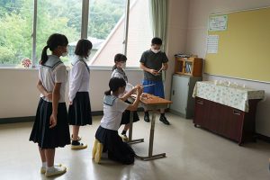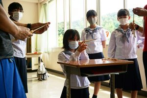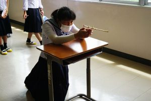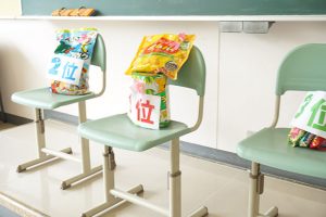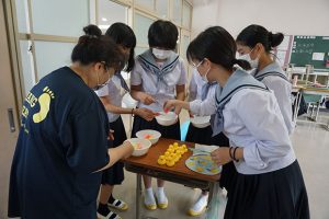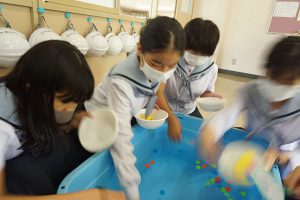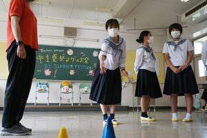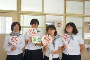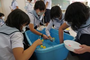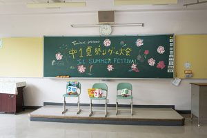 今年は新型コロナ感染症の為、多くの行事がキャンセルになり、学園祭もなかったことから、「初めての中学校生活の1学期を楽しいもので締めくくりたい!」担任と副担任のそんな願いから『Teachers present☆ 中1夏祭りゲーム大会』を開催しました。縁日や祭りでよく見る射的、輪投げ、金魚(?)すくいを教員が手作りして中1の教室内に出店し、チーム対抗で点数を競いました。出店のおっちゃんとおばちゃんは先生が担当しました。金魚(?)すくいでは高得点のアヒルを総取りするチームや、射的ではプロ級のスナイパーがいるチーム、輪投げでは手堅く2点狙いと冒険の5点狙いで大失敗のチームといろんなチームカラーが見られました。1位、2位、3位には豪華賞品が…!