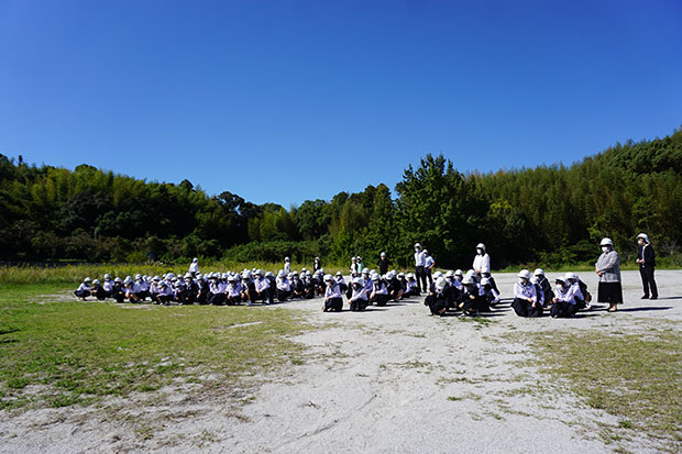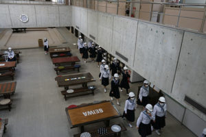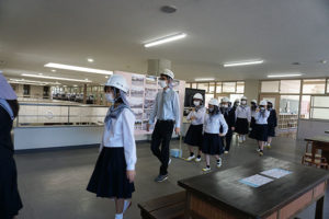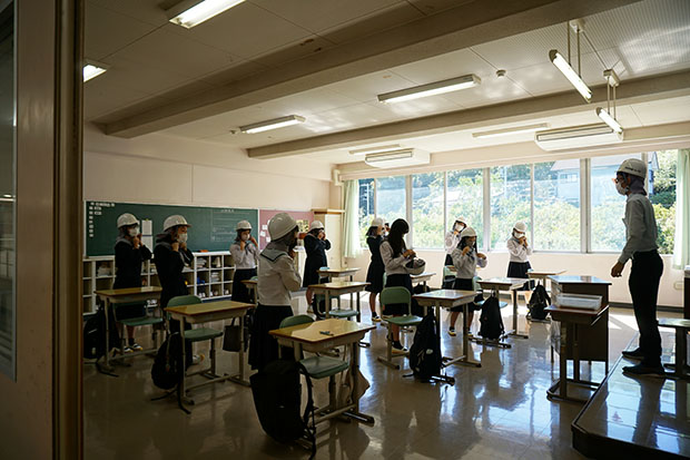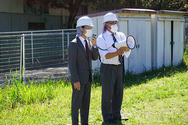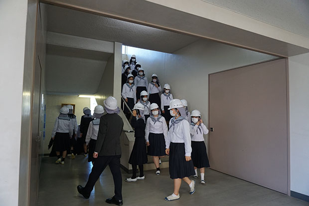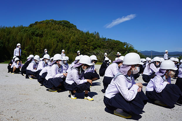 そこからいくつもの安全確認が行われます。それが終わると、避難場所への移動です。今回の避難場所のグラウンドにすべての生徒と教職員が集まるまでに3分30秒かかりました。遅くはありません。迅速に行動できたと言えます。けれど一人ひとりの命を守るためには、さらに素早い行動が求められます。小西校長から次のような話がされました。「訓練が訓練に終わってほしい。けれど南海トラフ地震は高い確率で起こることは間違いない。大きな地震と津波はそれぞれが築いてきた人生や関係を一気に奪い去る。多くの命も奪われる危険の中におかれている。その時に生か死を分けるのは、