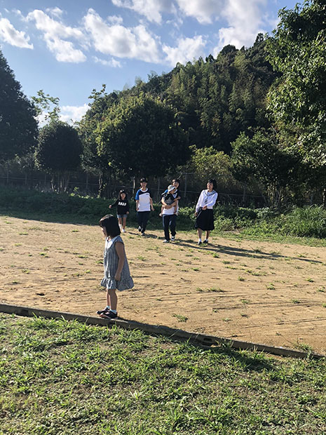 生徒たちは、足が痛いと言いながらも子どもたちと一緒にグラウンドを歩いていました。