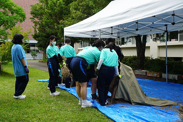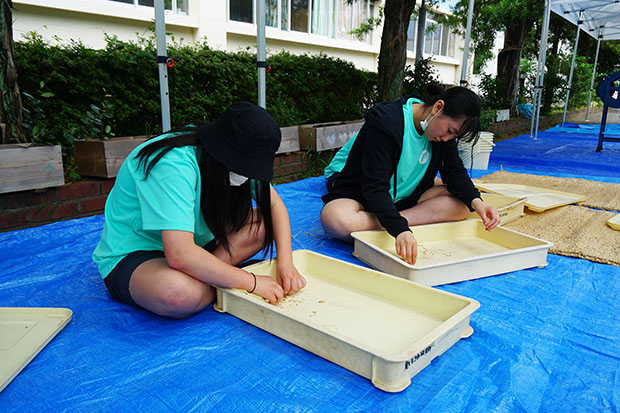 この授業での脱穀は、足踏み脱穀機を使い風唐箕でもみと種を選別する昔ながらのやり方で行っています。脱穀初体験の中1も、先生や先輩のアドバイスを受けてみんな体験することができました。高2の選択授業では、足踏み脱穀機の仕組みや、江戸時代ころまでは道具を作ることから大変だったので「小麦粉」は大変貴重な食材で、「うどん」なども一部の人しか食べられなかった話なども聞きました。中学校の授業では、作業の中で自然と役割分担ができ、片付けを含め最後まで効率よく授業を行うことができました。小麦は全部で8リットル足らずの収量でした。少し少ないし、これまでに比べると質もあまり良いとは言えませんが、有機栽培は天候に大きく左右されます。それも含めて生徒たちが感じてくれるものがあればと思います。次回9月の授業は「製粉」をします。