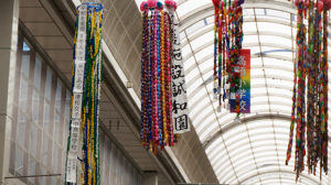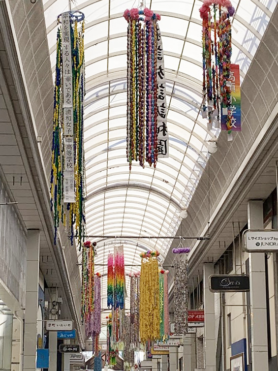 平和資料館・草の家の依頼を受けて、京町商店街の「平和七夕まつり」に合わせてアーケードに飾る千羽鶴を折りました。生徒と教職員が祈りを込めて折った鶴は約7500羽です。「折る」と「祈る」はよく似た漢字です。テーブルの上に手を置いて鶴を折る時の姿勢は、手を合わせて祈っているように見えます。大人の身勝手な理屈によって無差別攻撃を受け、命を奪われようとしているガザやウクライナの子どもたちを神さまが守ってくれるように、そして一刻も早く攻撃が止み、平和な時間がやって来るように、折り紙の色は4色にしました。青色と黄色はウクライナの国旗の色です。2つを混ぜ合わせると平和を表す緑色に、そして平等を表す白色を加えました。標語は清和の建学の精神「平和をつくり出す人は幸いである」にしました。