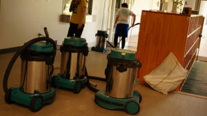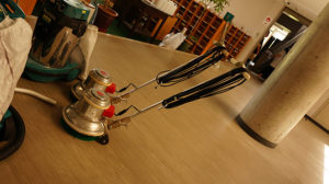 ⓵掃きそうじ・拭きそうじ ②ポリッシャーをかける(バキューム掃除機)