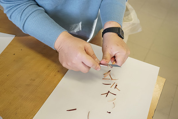 清和は小規模ながら放課後は色々部活動も行われていますが、この度、卒業生の香取さんをお迎えして毎週金曜日に”デッサン“教室を行います。この日は5名の参加者でした。初めての教室なので、まず鉛筆の種類や消しゴム、クリップなど必要な道具の説明を受けました。それからデッサン用に鉛筆の削り方を学びました。デッサンではびっくりするほど長く芯を出す方法で削ります。そもそもカッターナイフで鉛筆を削ったことのない生徒がほとんどで、ぎこちなく削り始めましたが先生の助けでなんとか削り終わりました。道具が整ったところでいよいよデッサン開始です。この日はいろんな立方体の石膏をデッサンしました。この教室では徐々にデッサン力を身につけ、最終的には美大の試験にもなる人物の石膏をデッサンできるように頑張ります。