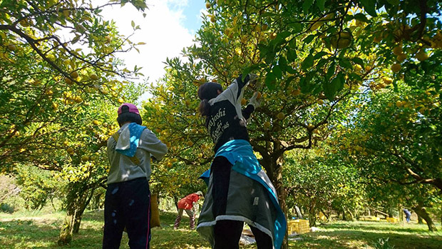 天気にも恵まれ、澄み切った青空、山の緑や紅葉、そしてその中で黄色く光る柚子。まさに絶景でした。広大な敷地の柚子を、傷つけずに一つ一つ手作業で丁寧に狩るのはとても大変でした。しかし、その分農家さんの大変さや大切に育てた柚子への愛情を知り、時間を忘れて作業しました。