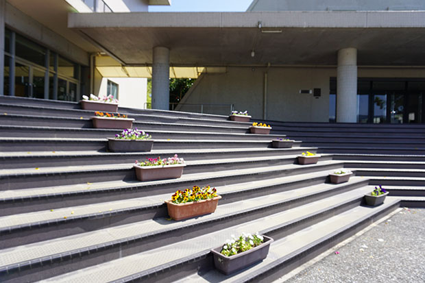 プランターのパンジー 正面玄関の階段にプランターが並んでいます。手入れが行き届いています。教頭の山脇先生が定期的に植え替えています。毎朝の水やりも同先生の日課になっています。夏頃にはペチュニアなどに代わるはずです。