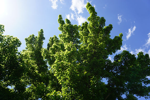 グラウンドのモミジバフウ グラウンドの向こう側のフェンス沿いに一際存在感のある木がそびえています。中庭にもあるモミジバフウです。今が伸び盛りでしょうか。日に日に葉が大きくなっていくのがわかります。風に吹かれて揺れる木は意志がある生き物のように感じます。