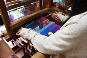 それぞれが好きな横糸を選び、思い思いの作品づくりに取り組みました。中には、横糸の色を何種類も使って縞模様を上手に表現している生徒もいました。