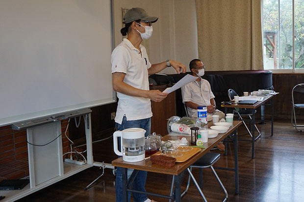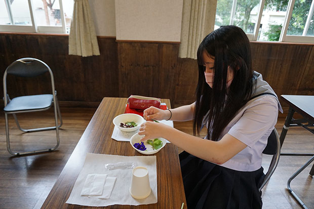 そして、そのハーブを実際に使ってみようとまずハーブティを作りました。ハーブには相性があるので、「レモングラス・レモンバーム・バタフライピー」のブルーのお茶と「ハイビスカスローゼル・ステピア」のピンクのお茶を作って飲んでみました。ハーブティは好みがあるので、苦手な生徒もいて感想は様々でした。ピンクの「ハイビスカスローゼル・ステピア」のお茶の方が若干人気がありました。でも一番美味しいと好評だったのは、「ステピア」だけの甘いお茶でした。特に甘いのに飲んでも太らないという点が気に入ったようでした。