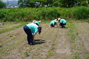 今回の教養の授業は、まず「塩ハウス」で製塩箱の状況を観察しました。連日の晴れ続きで、製塩箱の海水の蒸発はかなり早くなっています。海水が干上がるとまた1から始めなければいけません。生徒たちに海水を足してもらい、海水をかき混ぜました。そして、前回の授業で定植したサツマイモの苗の状況を観察し、うまく定着してない苗がないか確認しました。また、ハーブの状況も確認しました。一つ何かに食べられていましたが、概ね順調に育っていました。午後からの授業は、冬に仕込む「味噌」の材料の一つである大豆の種まきをしました。大豆は白大豆・青大豆・ハチマキ大豆・黒大豆と多品種を撒きました。大豆はカメムシなどの害虫に食べられやすく、有機栽培では育てるタイミングなど非常に難しいのですが、そのリスクも考慮して、多品種栽培にし、来週にも第二弾で種まきをします。