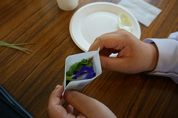 バタフライピーはブルーのお茶に、ハイビスカスローゼルはピンクのお茶になります。日本人はハーブティにあまり馴染みがありませんが、生徒たちはそれぞれのお茶の味を試していました。