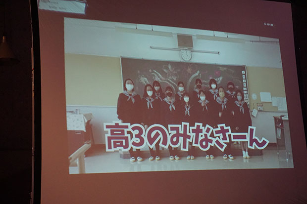 中2の生徒が描いた先生の似顔絵イラストと、そのイラスト当人の先生からのビデオメッセージを組み合わせた動画を作成した中学部からのエールで予餞会がスタートしました。
