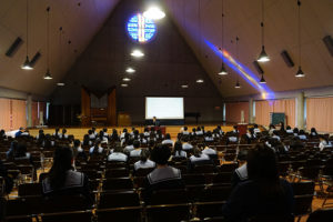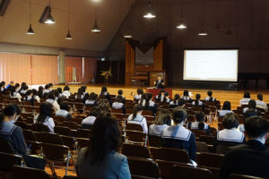 朝の礼拝を賛美礼拝として行い、ハンドベル・クワイアの「Amazing Grace」、ダウド・アンサンブルの「球根の中には」を聴き、祈りを合わせ、小西校長より「バイアスから自分を開放する」と題して、お話を聞くときをもちました。