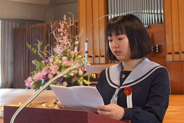 また、6年間清和で学校生活を送った卒業生代表が、清和で学んだ価値観をとおして卒業の言葉を述べました。その価値観とは、「一人一人が必要とされ、愛される価値がある」というものです。自分を認め、人を認め、お互いの存在を尊重し合える、大切にし合える人になりたいと、涙ながらに感謝を込めて語りました。