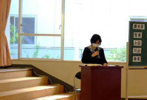 続いて小西校長が冤罪で服役している主人公が20年目に自由になれたのは、そこに聖書の存在と力があったこと、聖書の言葉が人生を生かし守る道具として自分に与えられていることにあらためで気づきたいとの話をしました。