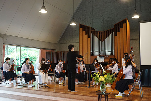 清和は毎年6月12日に学校記念日礼拝を行っています。今年は1日繰り上げて行いました。この日の礼拝では学校の足跡をたどります。創設者のアニー・ダウド宣教師は高知にキリスト教による全人教育(人間教育)を行う共同体を作ろうとしました。それは痛みと悲しみを背負った二人の少女に出会ったからです。彼女たちの背後に、同じような痛みと悲しみを持つ若い女性が見えたからです。ダウド宣教師はその人たちのために、自分の持てるものを差し出しました。その延長線上に今の清和があることを考えるのが、学校記念日礼拝から始まる一日です。今年度も新型コロナウイルスの感染予防のために、在校生と教職員だけの出席となりました。宗教委員長の司会で礼拝は始まります。本当は大きな声で賛美歌を歌うのですが、飛沫を飛ばさないために声を出して歌いません。その代わり手話によって賛美歌を歌いました。ダウド宣教師の働きを映像とナレーションによって放送委員が紹介し、ハンドベル部とダウドアンサンブルの賛美歌演奏、小西校長による「アニー・ダウド 旅のはじまり」と題した説教を聴きました。賛美歌452番を清和は校歌にしていますが、今回は英語科のステファニー・ローエン先生が1番を二言語と英語で独唱してくれました。荘厳な前奏と後奏によって心が引き締まる礼拝となりました。新たな気持ちで学校生活に取り組むことができそうです。校舎2階ホールには清和の歴史のパネルが展示されています。4月に入学をした人たちが熱心に写真や年表に見入っているのが印象的でした。
