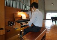 寺田夏樹先生、朝の全校礼拝 奏楽デビュー